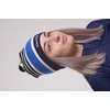 Шапка отличается стильным дизайном с поперечными цветными полосами и небольшим помпоном в тон. Фирменная вышивка логотипа добавляет акцент брендовости.