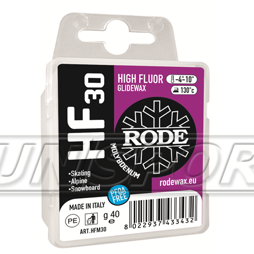 Серия RODE HF: Высокофторированные углеводородные воски, подходящие для всех типов снега и высокой влажности. Новый состав был полностью переработан в поисках более эффективных компонентов, но также и более устойчивых с экологической точки зрения. Кроме того, используемые фторсодержащие добавки не содержат PFOA, что соответствует европейским нормам. Их можно использовать отдельно или в качестве основы для полностью фторированных порошков или жидкостей. Доступен в упаковках по 40 г и 180 г.